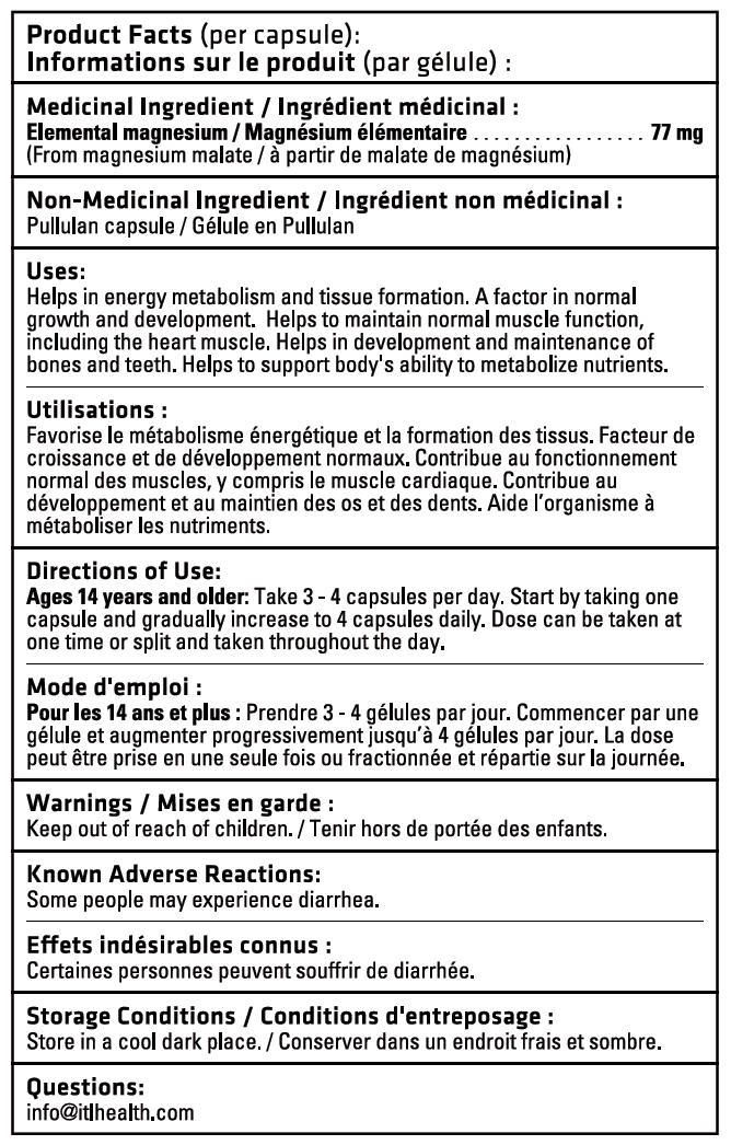 As with all ITL Health products, MAGmal8 is produced in small batches with a strict focus on purity and transparency. Each capsule contains only magnesium malate, with no fillers, flow agents, or manufacturing additives.